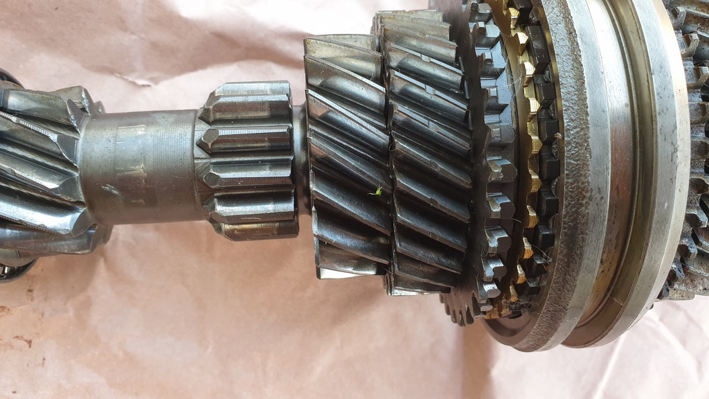 Die beiden Räder für ersten und zweiten Gang, welche mit der Welle vergossen sind, sind noch in gutem Zustand. Wie Sie auf den Bildern erkennen können, ist das Rad des dritten Ganges defekt und muss von Ihrem Getriebe übernommen werden. Vierter Gang ist wieder gut.