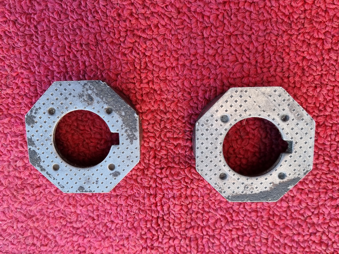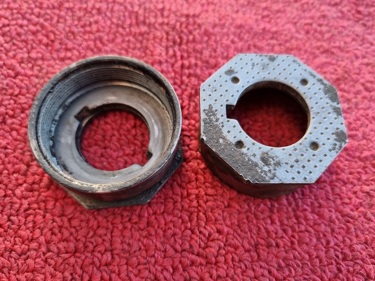 Noch guter brauchbarer Zustand – siehe Bilder. Diese Kappen sind für die Serienstoßdämpfer und für Bilsteindämpfer nicht verwendbar. Die Maße sind: Bohrung für Dämpferstange ist 28 mm, Verschraubung Durchmesser am Federbein 47mm, Durchmesser am Sechskant 54mm und die Höhe gesamt ist 21,5 mm. Alles auf den Fotos dokumentiert.