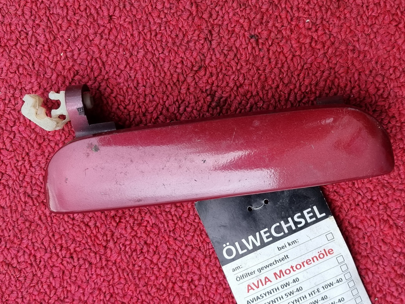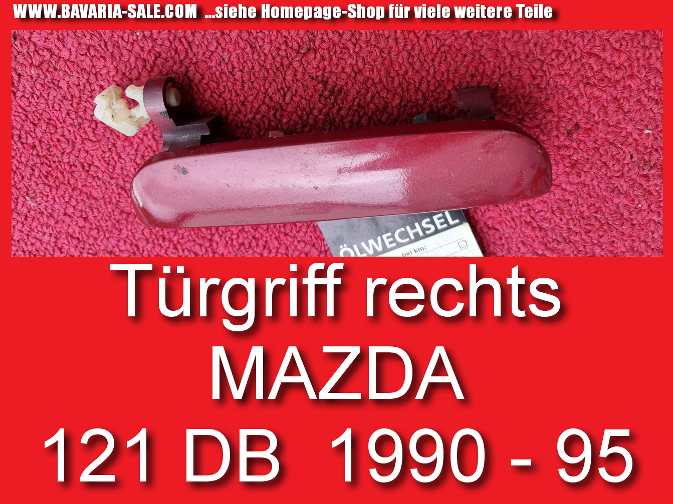 Türgriff außen für vorne rechts eines 4-türigen Mazda 121 DB von 1990 bis 1995. Es sind auch noch für die anderen Türen Teile vorhanden. Der Griff ist in Weinrot met. lackiert, es sollte aber auch einer in Schwarz vorhanden sein.